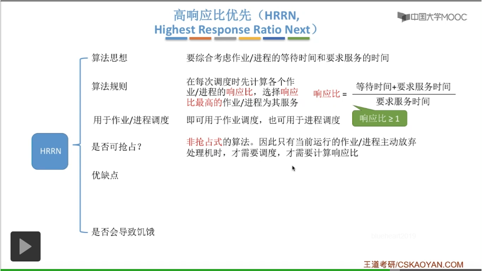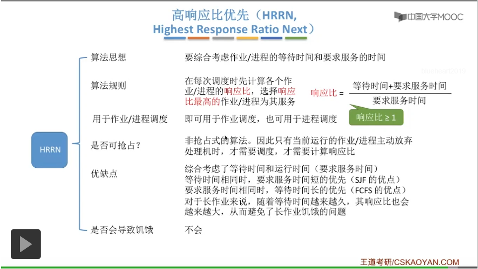 对于一个长作业来说,随着等待时间越来越大,那么它的响应比肯定也会越来越大,所以它被调度的机会也会越来越高,所以这个算法也避免了短作业优先这个算法造成的这个长作业饥饿的问题,所以这个算法其实是不会导致饥饿的。