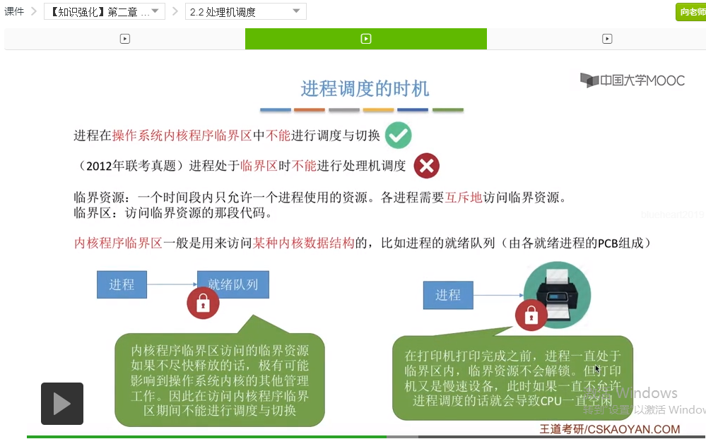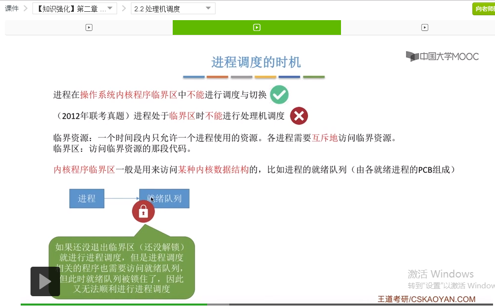 因为普通的临界区访问的这些普通的临界资源,并不会像之前所说的这个例子一样,直接地影响到操作系统内核的管理工作。所以说为了增加系统的并发度,增加CPU的利用率,那么在访问这些普通的临界区的时候,是可以进行进程调度和切换的。那么讲到这里,刚开始的这两个问题,为什么前者对为什么后者错,相信大家已经有所理解了。