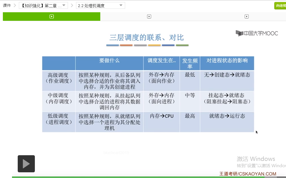 我们再来整理一下三层调度的联系和对比。这三层调度分别要做什么相信刚才的讲解应该已经比较细了,这儿就不再展开。那么高级调度和中级调度这两层调度是发生在外存和内存之间的调度,区别在于高级调度它是面向作业的调度,一个作业在刚开始会被调入一次被调出一次,并且作业调入的时候会为这个作业建立相应的PCB,也就是建立它相应的进程。而中级调度(内存调度)它是面向进程的一种调度,它是把暂时不会运行的进程相关的进程映像、相关的一些数据把它调到外存里,然后之后通过中级调度再把这些进程的数据从外存调回内存。而低级调度它是内存和CPU之间的一个调度。对于这三层调度的发生频率来说,它们的发生频率依次是从低到高的。而这三种调度对进程状态的影响是高级调度,它有可能会使一个进程从无到创建态,最后当它创建完了PCB创建完毕之后,还会把这个进程放入到就绪队列里,让它进入就绪态,所以它对进程状态的影响的是这个样子(无->创建态->就绪态)。而内存调度它会使一个处于挂起态的进程重新回到就绪态,而如果挂起态又细分为阻塞挂起和就绪挂起的话,那么也可以说它可以使一个处于阻塞挂起的进程从新回到阻塞态。而低级调度也就是进程调度,它是选择一个处于就绪态的进程让它进入运行态,投入处理机开始运行,所以这是这三种调度对进程状态的影响。
