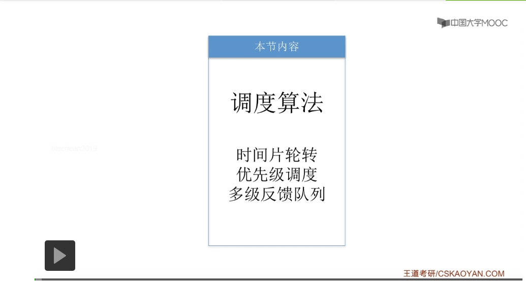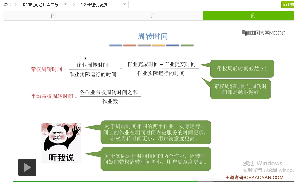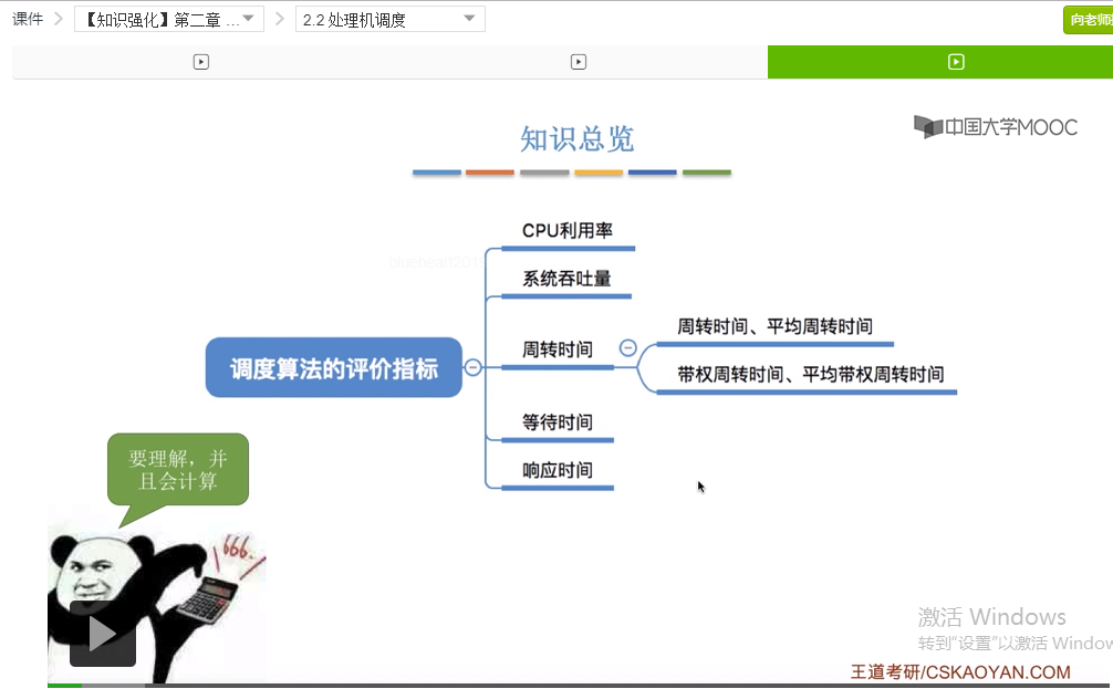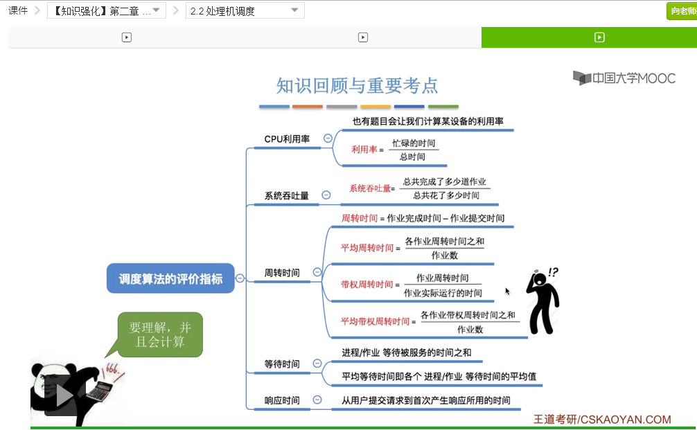 好的那么我们再来回顾一下,这个小节我们介绍了五种用来评价调度算法的指标。那么大家要理解各个指标为什么这么设计,并且还要会计算各个指标。其中CPU利用率和系统吞吐量咱们举了两个比较简单的例子,后面的其他的这些指标我们会在之后的对于算法的讲解当中再不断地进行实践,所以这个地方暂时没给出具体的例子。那这个小节当中比较容易忘记的是带权周转时间和平均带权周转时间这两个指标。那么大家需要结合咱们举的那个比较有味道的例子来理解这个指标为什么这么设计。只要理解了其实记住它就不难了。