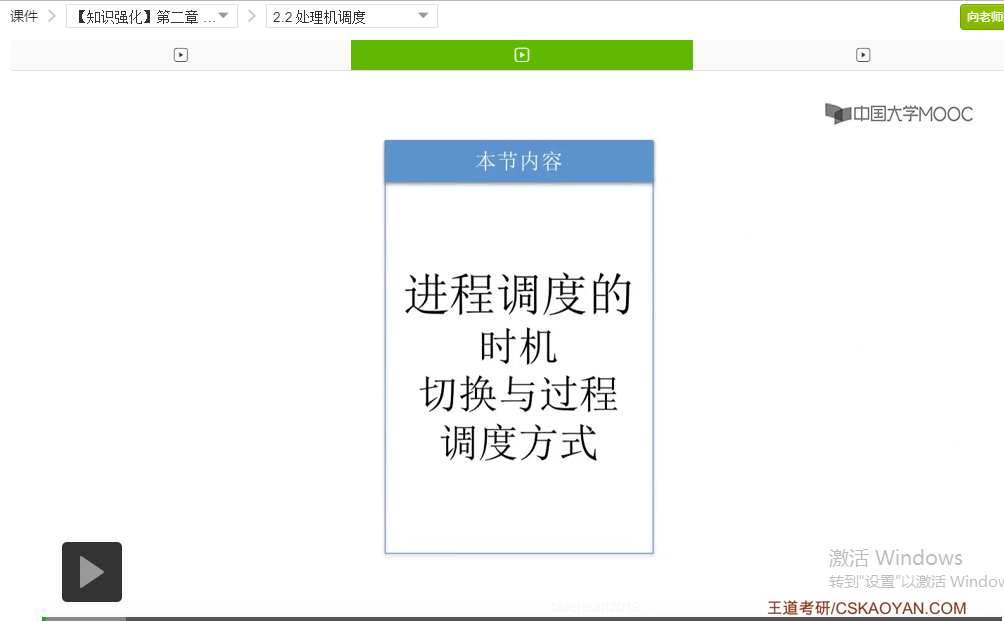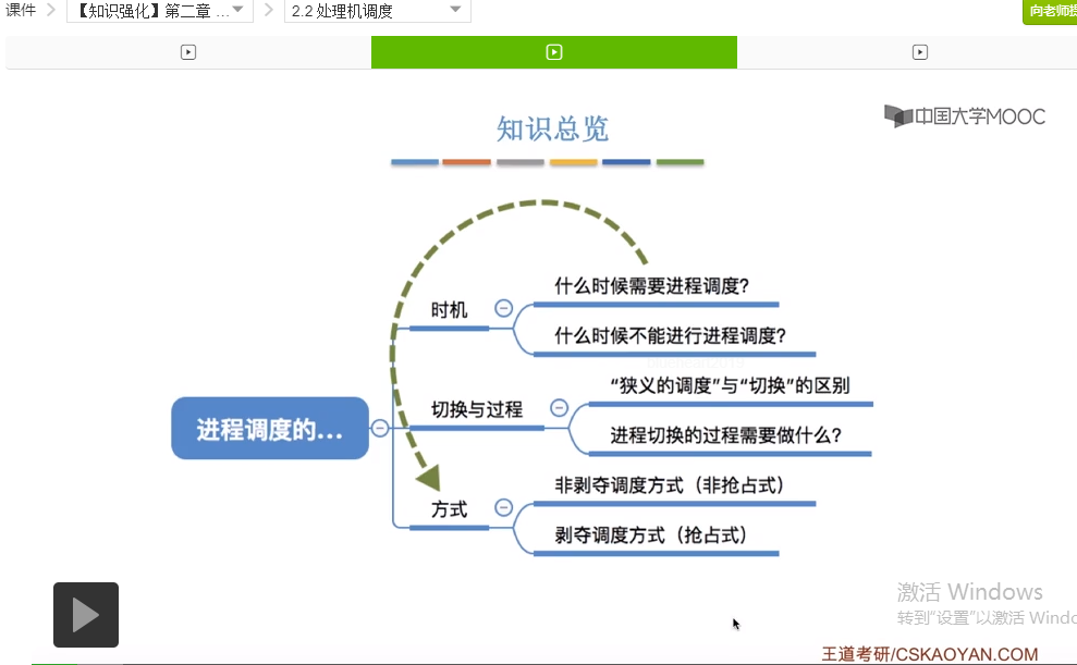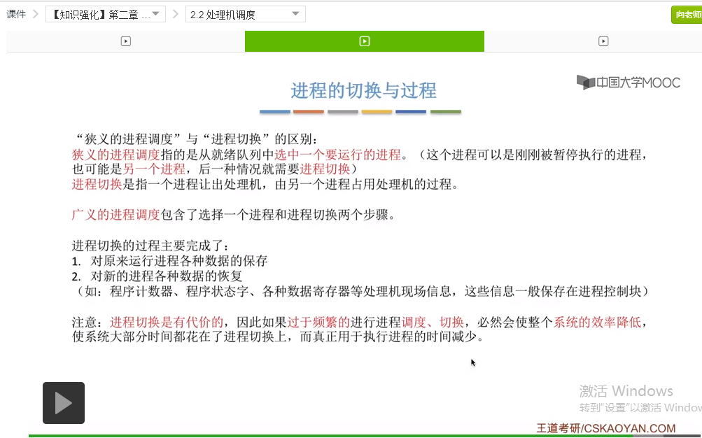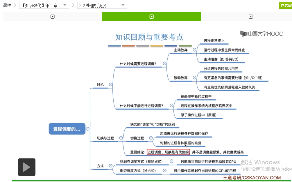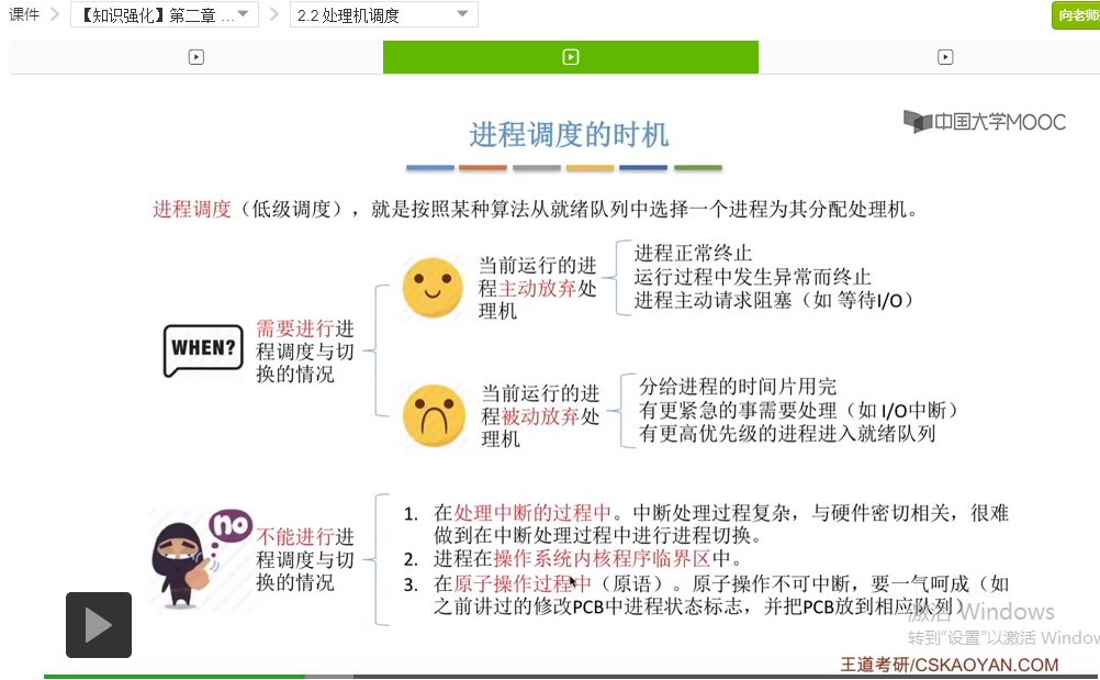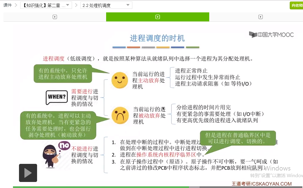 好的那么我们再来快速回顾一下这个小节的内容。这个小节的内容并不多,并且也不算是考试的重点,不过大家也需要理解。首先我们介绍了进程调度的时机,包括什么时候需要进程调度,分为进程主动放弃处理机和进程被动放弃处理机这两种情况,并且我们举了一系列的例子。之后我们介绍了什么时候不能进行进程调度。重点介绍了进程在操作系统内核程序临界区当中为什么不能进行进程调度,因为这个时候进程进行进程调度有可能会影响到操作系统内核的一系列管理工作。而如果进程处于一个普通的程序临界区当中,它访问的是一个普通的临界资源的话,这种情况下是可以进行进程调度的。这点是不太容易理解的难点,但是也不算重点。那么之后我们又介绍了进程切换的过程,其中大家最需要注意、最需要理解的是,进程的调度和切换是有代价的。只需要知道这一点就可以了,其他的这些有一个大体的印象就可以。另外呢我们还介绍了进程调度的两种方式,分为抢占式和非抢占式,而这两种调度方式会在之后咱们讲调度算法的时候大量的出现,所以继续学习后面的内容会对这两个部分的理解会更加深入。