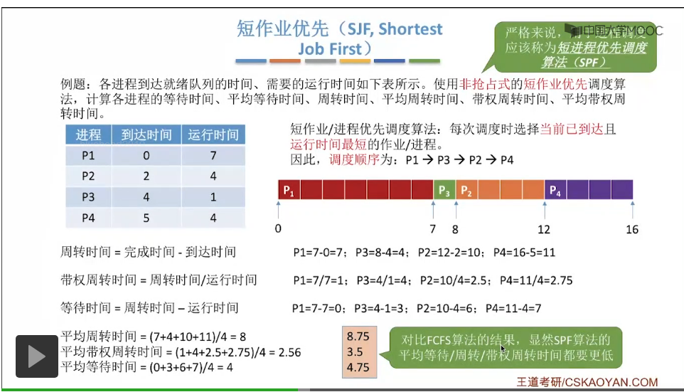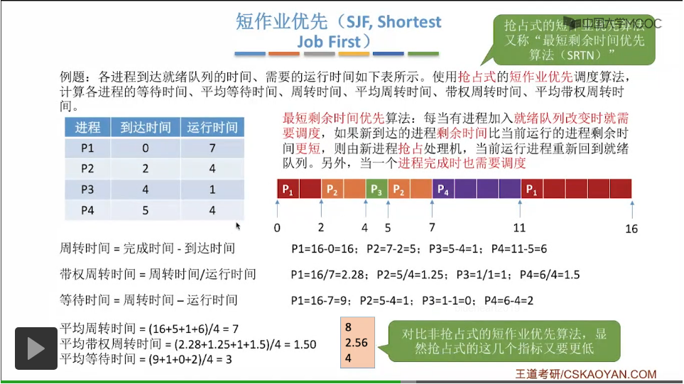 根据要求时间也就是运行时间来做优先级的排列。和之前先来先服务算法得到的这三个指标平均等待时间、平均周转时间、平均带权周转时间来进行一个对比会发现,使用了非抢占式的短作业优先算法之后,平均周转时间从8.75降为了8,平均带权周转从3.5降为了2.56,而平均等待时间从4.75降为了4,所以从这三个指标来看,短作业优先算法在这些方面的表现它是要优于先来先服务算法的。