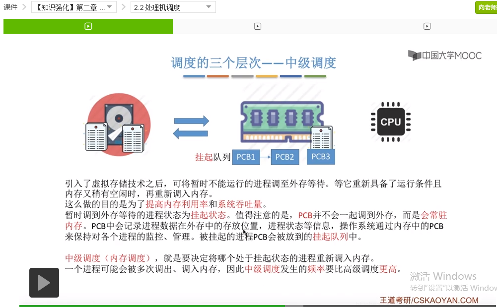 那么操作系统会为这些处于挂起态的进程建立一个所谓的挂起队列,把这些进程的PCB给用一个队列的方式把它组织起来,这个挂起队列就有点类似于咱们之前提到的所有的处于就绪态的进程把它组织成一个就绪队列,然后阻塞态的进程把它组织成一个阻塞队列,这其实都是为了操作系统方便管理而设计的一种机制。那么当这些进程需要被重新调入内存运行的时候,就会使用到所谓的中级调度或者叫内存调度。这个时候就需要决定我们需要把挂起队列当中的这些进程哪一个的数据先把它调回内存。相比于之前提到的高级调度,每一个作业只会被调入一次,调出一次这样的情况来说中级调度其实是可能会发生多次的。一个进程它有可能被多次的调出,多次的调入,所以中级调度的发生频率显然要比高级调度要更高一些。