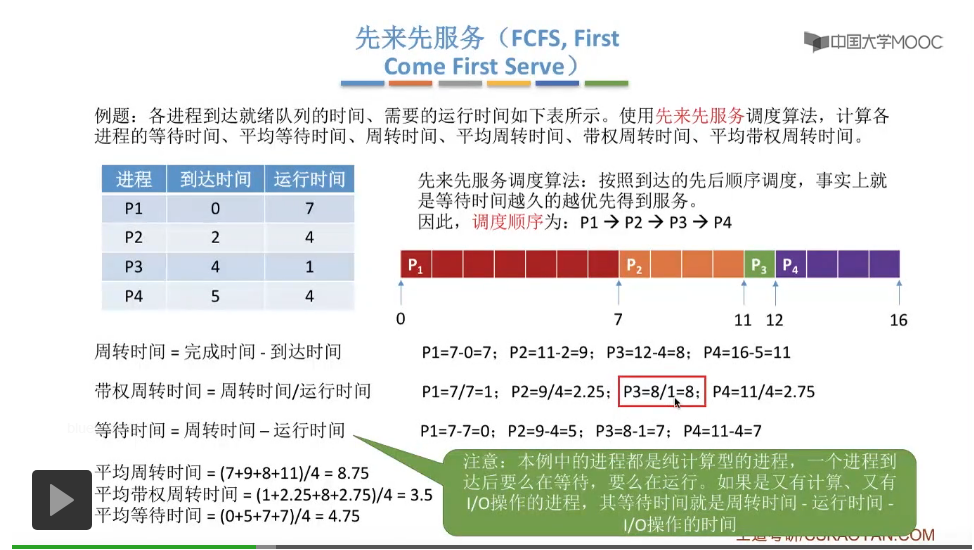 各进程的等待时间、平均等待时间、周转时间、平均周转时间、平均带权周转时间是评价一个调度算法的指标。这些进程其实都是纯计算型的进程,也就是说这些进程其实只需要CPU为它们服务,所以说一个进程在它到达以后,肯定只会有两个状态,要么它就是在等待被CPU调度,要么它就是处于运行的状态,所以对于这个题目这种纯计算型的进程来说,我们只需要用它的整个周转时间来减掉它的运行时间那么剩下的肯定就是等待时间这个部分。但是有的题目可能会给出的是一些既有计算还有I/O操作的这些进程。那么在计算这些进程的等待时间的时候我们就不能简单地用周转时间减去运行时间这样来计算,我们需要用周转时间也就是它整个完成时间到到达时间这个总的时间段的长度减掉它在CPU上运行的时间,还要再减掉I/O设备为它服务的这个时间,这样得到的才是这种又有计算又有I/O操作的进程的等待时间。