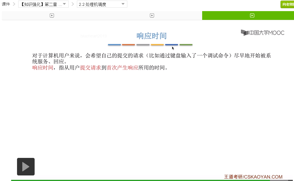最后我们再来讲一个叫做响应时间的一个指标,对于计算机用户来说如果说他提交了一个请求比如说就是在键盘里输入了一个调试命令,那么他肯定是希望尽早地被系统服务,被回应他提出的这个请求,所以响应时间指的就是这个用户从提出请求到首次产生响应所用的时间就叫响应时间。
