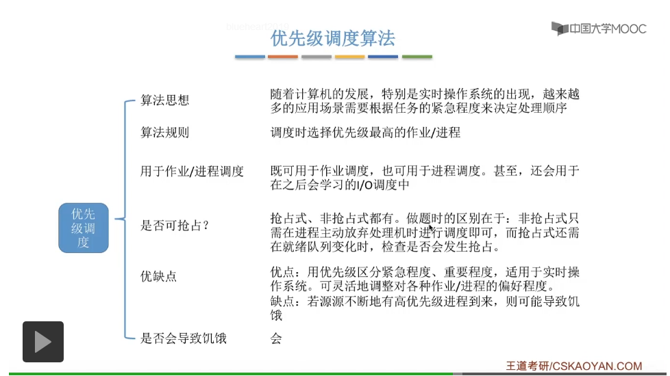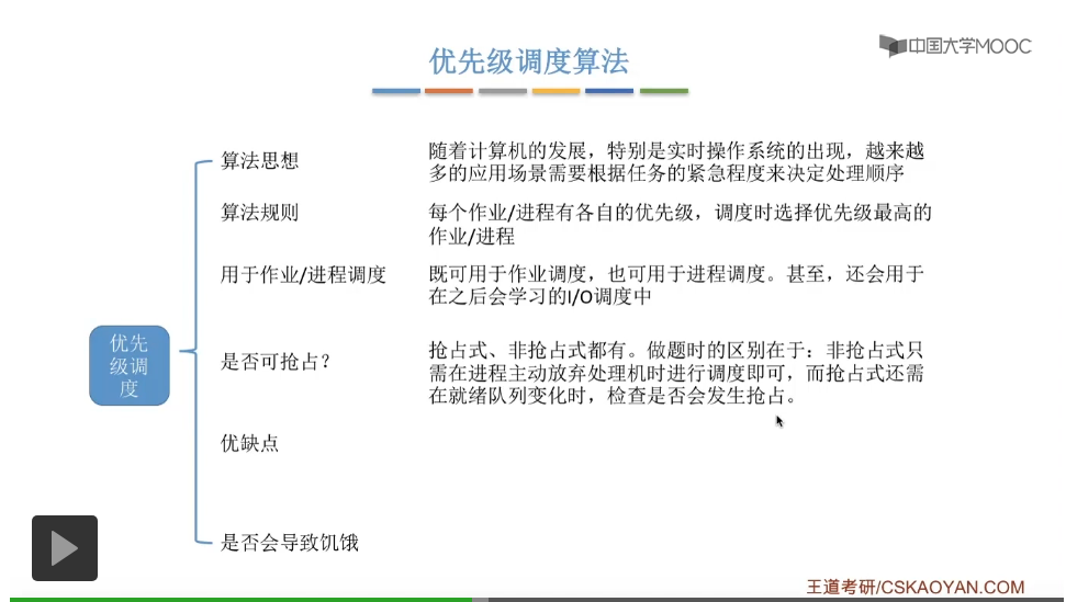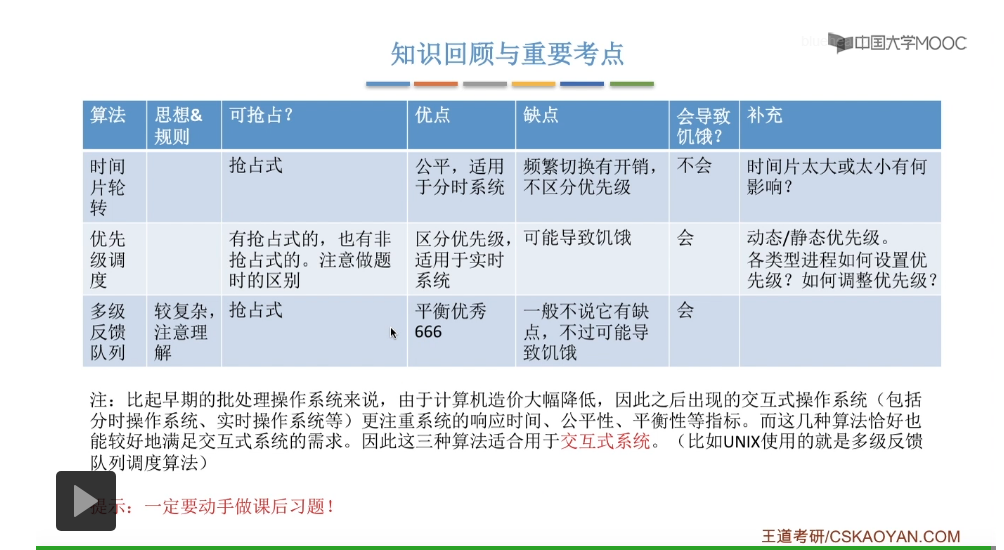 我们需要注意的是优先级调度算法它是有抢占式也有非抢占式的版本。在做题的时候我们需要注意的是非抢占式的优先级调度算法,我们只需要注意各个进程主动地放弃处理机这样的时刻,我们在这个时刻检查是否需要调度就可以了。抢占式的优先级调度算法除了需要注意各个进程主动地放弃处理机这样的时刻,还需要注意就绪队列发生改变的时候是否会发生抢占这样的事情。这三种算法的优缺点是更不容易被考察的,是否会导致饥饿学会自己分析。这三种算法是比较适合用于交互式系统的,因为比起早期的这些批处理操作系统来说,这个计算机的造价其实是越来越低的,所以之后出现的这些交互式的系统,包括像分时操作系统还有实时操作系统,这些操作系统它会更注重对于各个进程的响应时间还有公平性、平衡性这些指标,而不是一味地追求批处理操作系统当中的平均周转时间这些很宏观的一些指标,所以这三种算法刚好比较适用于交互式系统的一系列需求,可以提供比较快的响应时间,也可以用一系列的策略来追求公平、平衡的这种性能,所以它们是适合用于交互式系统的。