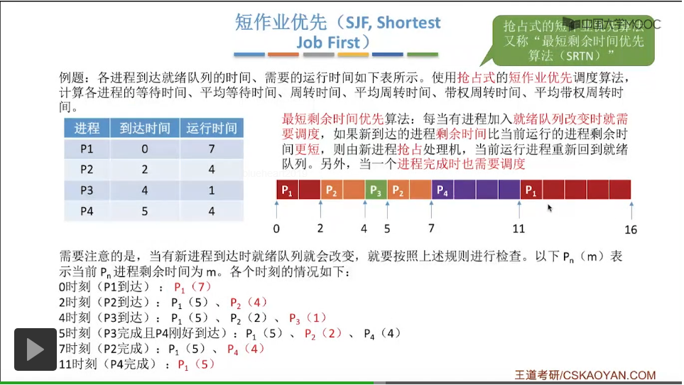 当前这个正在运行的进程如果被抢占处理机之后它就会回到就绪队列当中。另外呢,如果说当前运行的进程主动放弃处理机的时候,也就是一个进程它正常地完成的时候,也需要用这样的调度算法来进行一个调度,所以这是这种算法当中我们需要注意的两个时间点。一个是就绪队列改变的时候,另外一个是一个进程完成的时候。那么我们按照这样的规则来依次分析一下各个时刻。进程P2到达,就会发生短作业