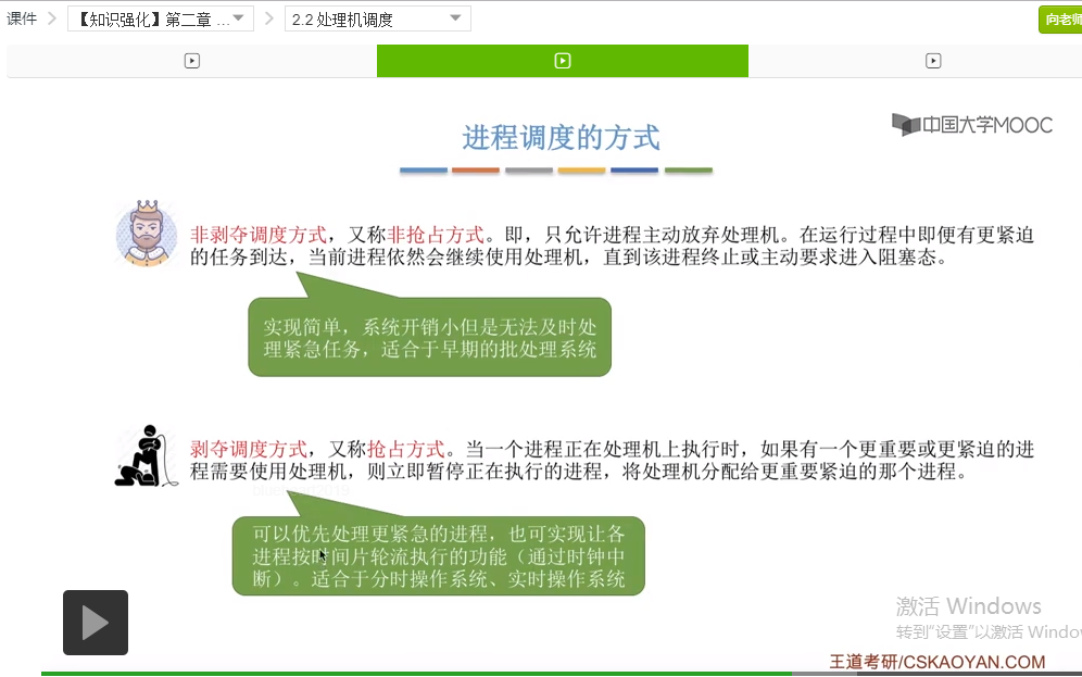 那么接下来我们再来看下一个问题。在有的操作系统当中,它只允许进程主动地放弃处理机,而不允许这个进程在运行的过程中,被迫地被剥夺处理机资源。但是又有的操作系统,它是允许当有更紧急的任务需要处理的时候,它是会强行地剥夺这个当前运行进程的处理机资源的,所以由这个问题就是当前运行的进程是否可以被强行地剥夺处理机资源这个问题,我们引出了下一个知识点。