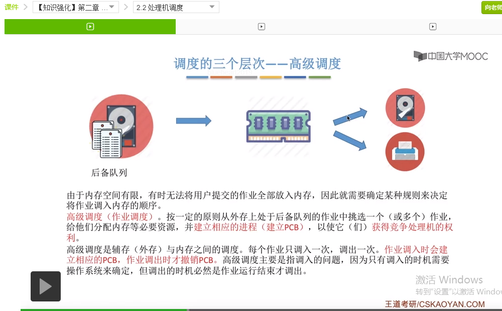 并且会撤销它的PCB。那么可以看到,其实作业调出的时机肯定是这个作业运行结束了才把作业调出,而作业调入的时机才是需要操作系统来管理、来决定的一个问题,所以所谓的高级调度主要指的其实是调入的问题,因为只有调入的时候我们才需要选择,而调出的时候只要这个作业运行结束了,就立即把它调出就可以了。那么这就是高级调度。