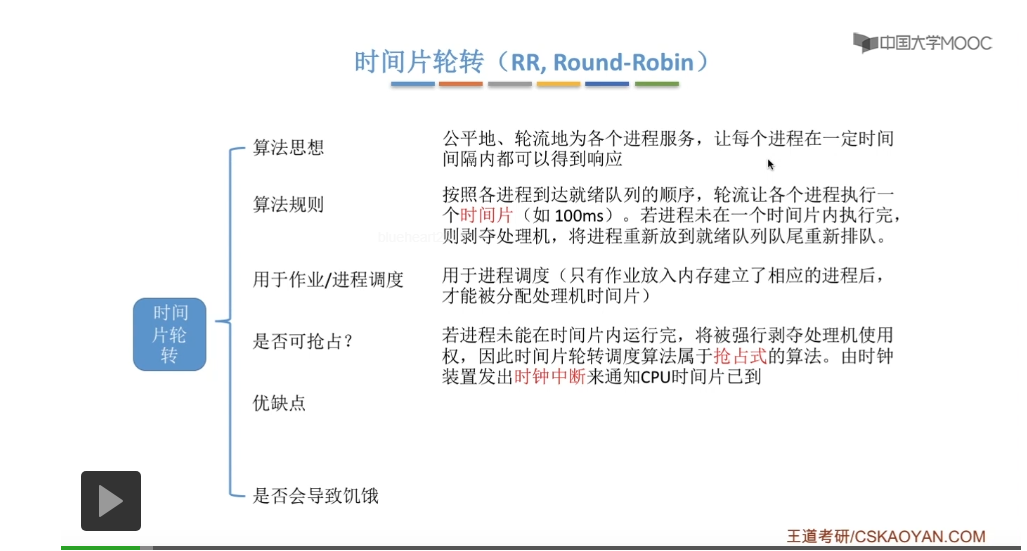 时间片调度算法它一般是用于进程调度的,因为所谓时间片其实指的是处理机的时间片,而一个作业只有当它放入了内存并且建立了相应的进程之后,只有作为进程它才有可能被分配处理机的时间片。因为进程肯定是执行的基本单位,所以说这个算法一定是用于进程调度的。而通过刚才的这个描述我们会发现,当一个进程它的时间片用完之后,虽然说它还没有结束,但是有可能会被强行地剥夺处理机这个资源,所以说这种算法肯定是一种抢占式的算法,并不一定要等到这个进程主动地放弃处理机才会发生调度,而这种抢占、时间片的切换是由时钟装置也就是某一种计时的硬件来发出时钟中断来通知CPU时间片已到的。而时钟装置、时钟中断这些具体的内容会在计算机组成原理里面进行学习。如果不考计组的同学只需要有个了解、有个印象就可以了。