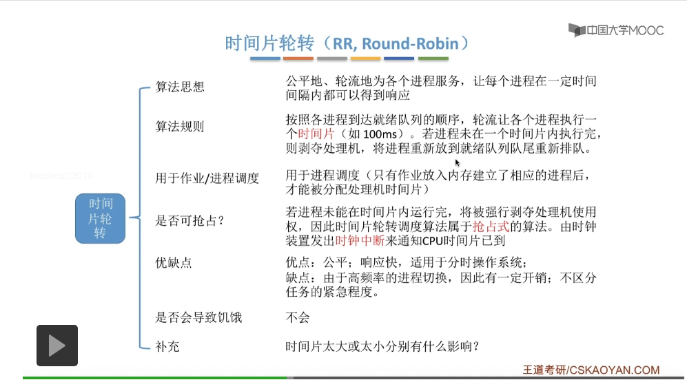 时间片轮转调度算法的优点很明显,就是对各个进程都是公平的,会轮流地为它们服务,并且响应很快,只要我们设置的时间片大小是合理的,那么就会在一定的时间间隔内就可以给各个进程、各个用户都有一个响应,所以这种调度算法就比较适合于分时操作系统,可以为各个用户分配一个大小的时间片。而缺点呢就是用于进程切换的时候会有一定的开销,另外这个算法它并不区分任务的紧急程度。这种算法是不可能导致饥饿的,因为它肯定是轮流地会为各个进程服务。时间片太大或者太小分别会有什么影响,这个在选择题当中经常会作为考查。那以上就是时间片轮转调度算法。