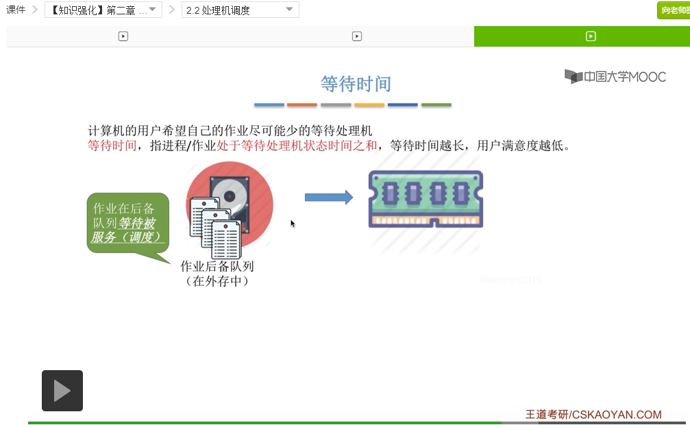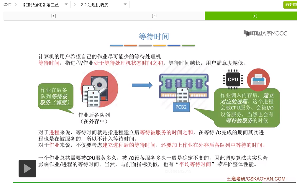 接下来我们再来看下一个指标叫等待时间。对于计算机的用户来说肯定是希望自己作业尽可能少地等待处理机。那么等待时间就是用来度量这个用户的作业等待处理机等待被服务的这个时间之和到底是多少。等待越长肯定用户的满意度就越低,那么我们先来看一下当一个作业刚开始被提交的时候,它是被放到了外存中的作业后备队列当中。作业在后备队列当中需要等待被服务也就是被作业调度。