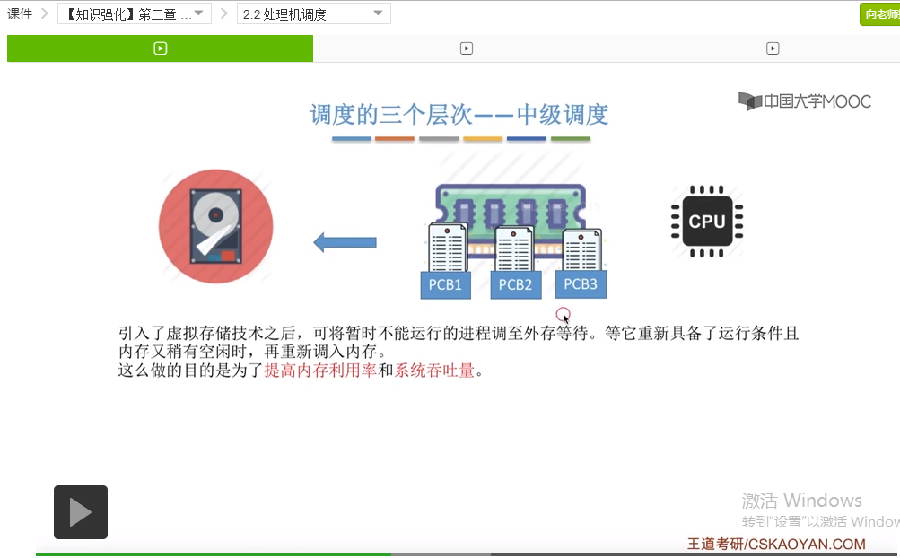 接下来我们再来看一下什么是中级调度。我们知道当一个作业被调入内存之后,它会建立起相应的一些进程。但是在第三个章节当中,大家会学到一个所谓的虚拟存储技术。这个地方大家只需要有个印象就可以,之后会有详细的学习。我们会把这个内存当中暂时有可能运行不到的这些进程把它相关的一些数据调到外存等待,然后一直到这个进程重新具备了运行的条件或者说内存又有空闲空间的时候再把这个进程相应的数据给调回内存。这么做的目的很显然就是可以提高内存空间的利用率,我们可以尽可能地保证当前处于内存当中的这些进程都是可以运行的这些进程。这样的话系统资源的利用率就会更高,并且系统的吞吐量也会相应的增大。