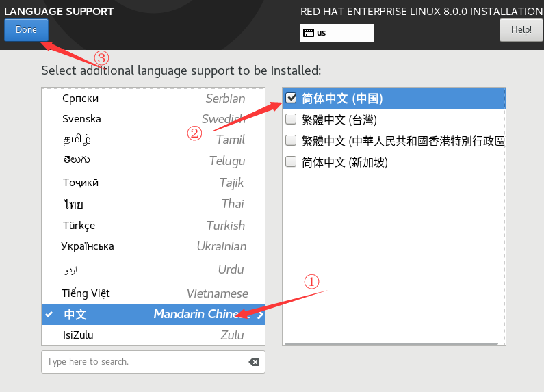 注意细节:在 Language Support 设置中,将简体中文勾上,否则你后续在这个系统中放一个中文文档,可能会显示乱码,但是默认语言还是 English。
