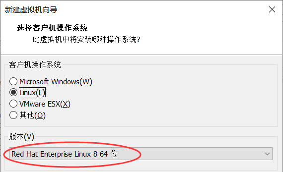 客户机操作系统选择"Linux",版本选择"Red Hat Enterprise Linux 8 64位"。