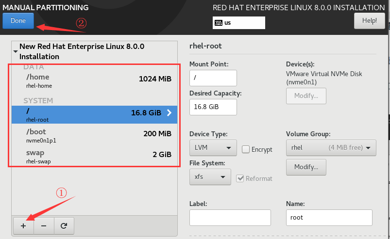 7、 安装目的地(磁盘分区),选择:“自定义” ==> 点击“完成”就会弹出该框进行磁盘分区了