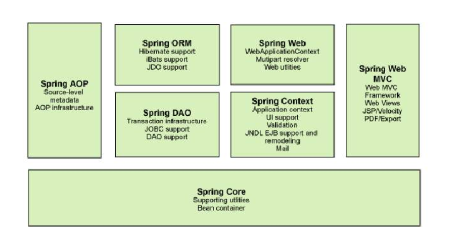 - 核心容器:核心容器提供Spring框架的基本功能,主要组件是BeanFactory,是工厂模式的实现。其BeanFactory使用控制反转(IOC)模式将应用程度的配置和依赖性规范与实际的应用程序代码分开