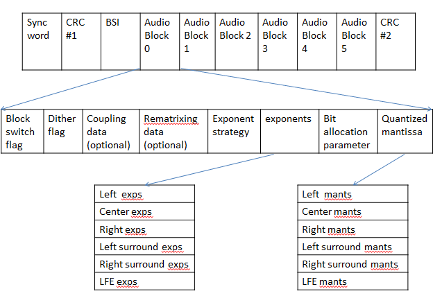 如果频谱在一个frame的6个audio block内改变很小,则只在audio block 0传送exponents, block 1~5使用block 0的exponents.