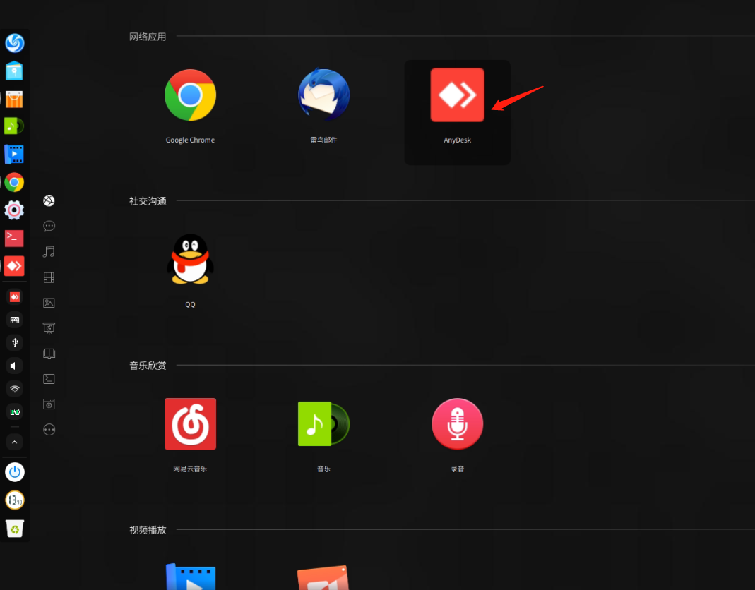 4、也可以在启动器中找到anydesk运行。