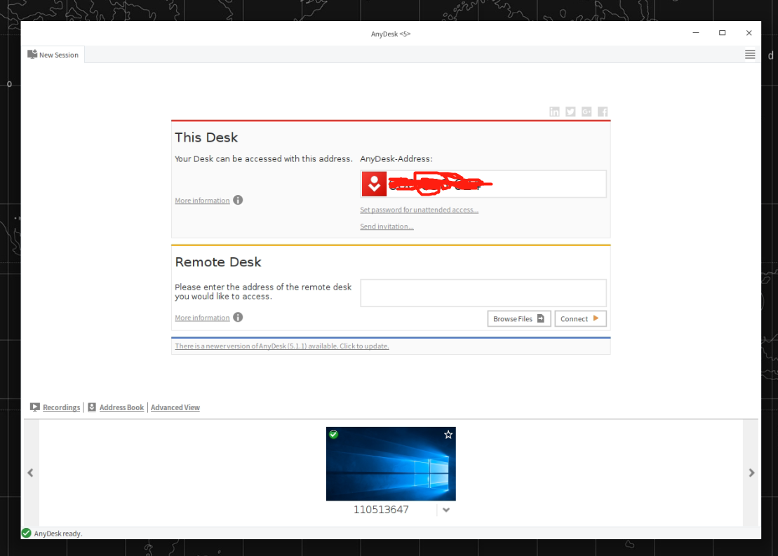 5、然后在anydesk的界面上面的地址即为本机的anydesk地址,在windows上运行anydesk只需输入这个地址连接即可。