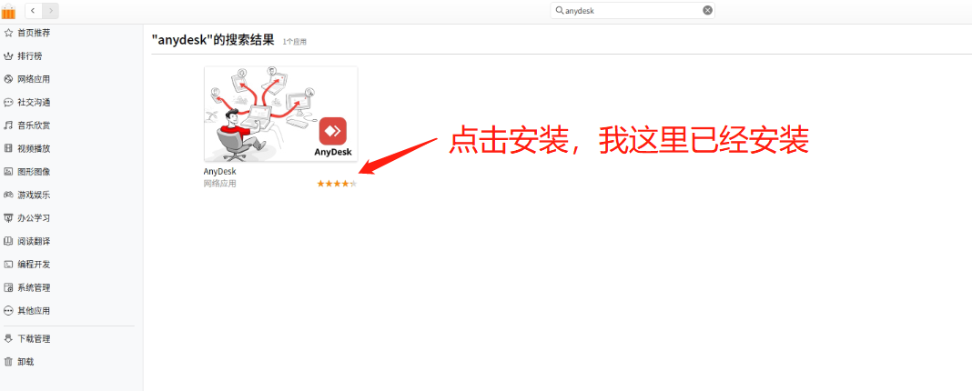 3、点击进入后按“安装”即可,安装完成即可在“深度商店”点击“打开”运行anydesk。