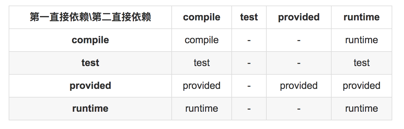 如下表,最左边是第一直接依赖范围,上面是第二直接依赖范围,中间交叉单元格表示传递性依赖范围。
