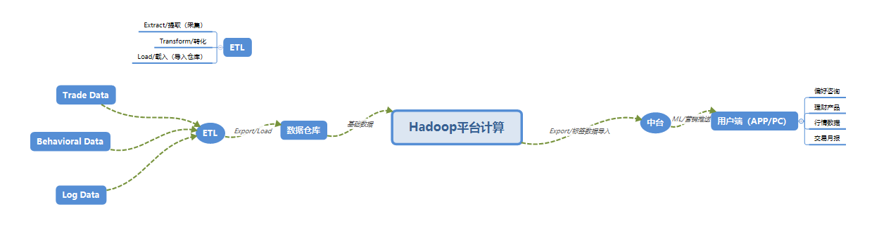 券商等金融机构,其用户每天都会产生大量的交易数据,这部分数据最初都会存储在客户的关系型数据库中(oracle),因此后台每天需要先进行数据采集,将数据采集至Hadoop的hdfs系统;数据采集过后,需要对源数据进行一次数据清洗工作:过滤异常数据(NULL)、筛掉关联性较高的数据。