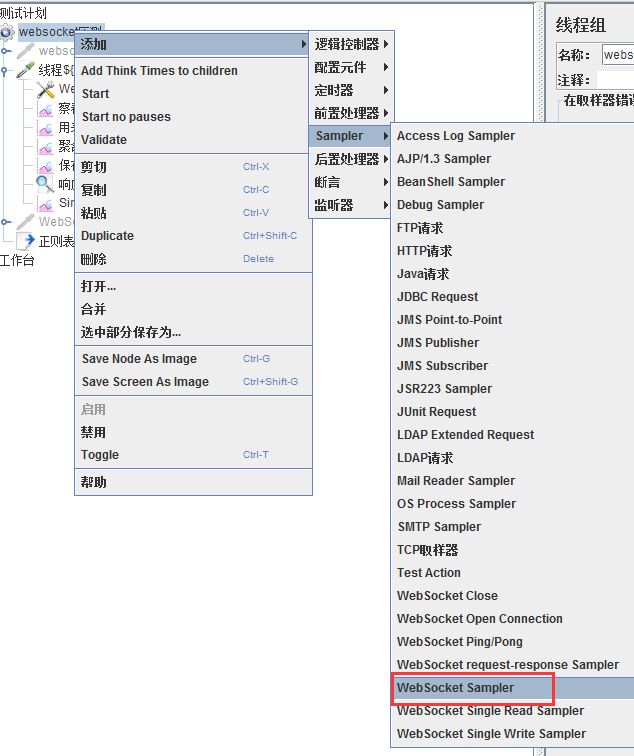 1) 选择鼠标右键选择上步添加的线程组->添加->Sampler->WebSocket Sampler,如下图: