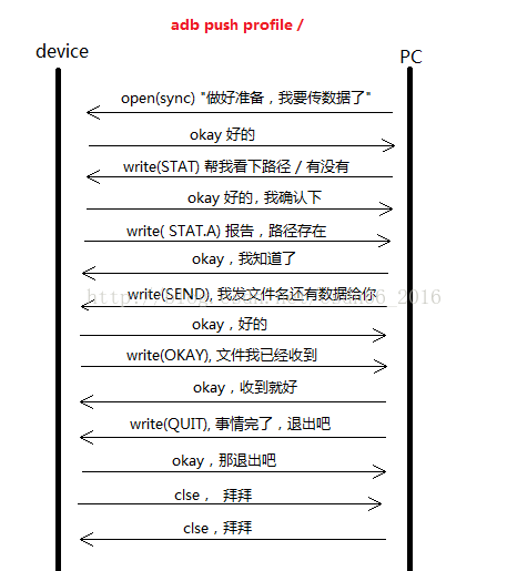 这样是不是容易理解多了呢,经过这样的数据发送,我们就通过adb push命令把本地的profile文件推送到远程设备的根目录了。哇..... 原来这么简单,一个profile文件就传输了。流程理解了,我们再来看代码,现在结果你知道了,流程你也懂了,再来看源码,是不是容易理解了呢。