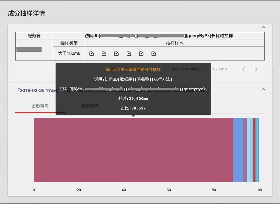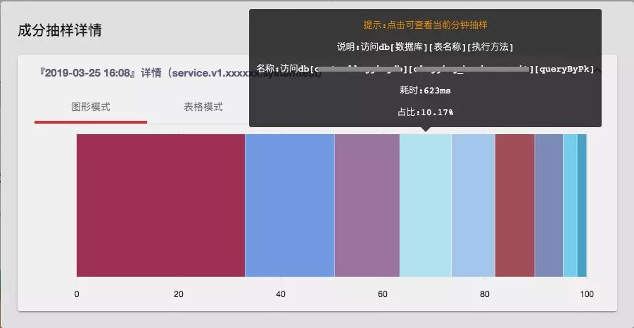 观察得到,在这一分钟内服务对各个外部链路的访问次数没有明显异常。但是数据库的访问时间出现了突增,可以明显看到访问数据库对应的成分的耗时占比在整个调用中的比例扩大了。继而,我们去查询对应现象发生的当前分钟的情况,通过详情面版继而可以定位到是针对特定的数据库、表的访问出现了异常。在此之后,通过收集而来的异常 Trace,可以进而为后续定位服务发生耗时异常的根因分析提供线索。