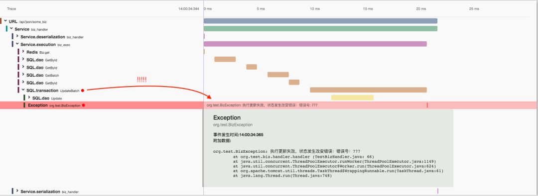 当服务发生异常时,一个完整的 Trace 也可以帮助用户快速定位问题根因。异常状态会从异常产生的具体节点上浮到对应的事务层级。这样的组织方式有助于排障人员发现到底是哪一个下游服务,哪一个DB还是自身执行发生了问题, 同时异常抛出时的 StackTrace 也会被附加到对应的 Transaction中,方便用户回溯异常产生的现场。