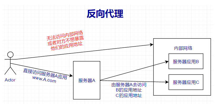 用户需要访问一些服务器应用,但对方不想把服务器应用地址暴露给用户,这样可以确保安全。那用户如果访问呢?可以通过反向代理服务器,用户只需要知道反向代理服务器地址就可以,最后由反向代理服务器去访问服务器的应用