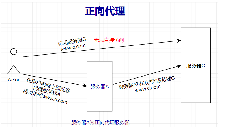 用户要访问服务器C,但因为网络原因无法访问;但服务器A可以访问服务器C。这样用户可以把服务器A设置为正向代理服务器。由服务器A去请求服务器C,然后服务器A把数据返回会用户。