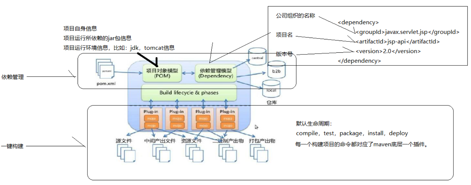 Maven 包含了一个项目对象模型(Project Object Model),一组标准集合,一个项目生命周期(Project Lifecycle),一个依赖管理系统(Dependency Management System),和用来运行定义在生命周期阶段(phase)中插件(plugin)目标(goal)的逻辑。