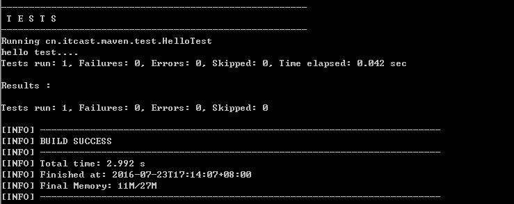 cmd 执行 mvn test 执行 src/test/java 下单元测试类,下图为测试结果,运行 1个测试用例,全部成功。