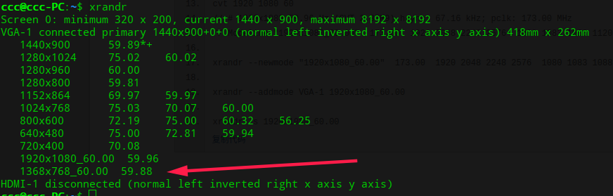 xrandr --addmode VGA-1 1368x768_60.00