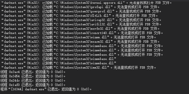 下载后放在..\darknet-master\build\darknet\x64下,打开该目录,双击darknet_yolo_v3.cmd会出现以下结果,表明成功编译。