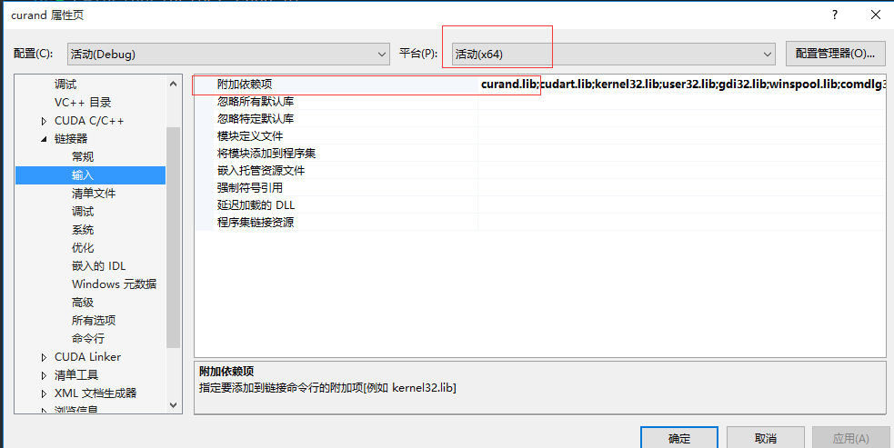 在右键项目 -> 属性 -> 配置属性 ->链接器 -> 输入 -> 附加依赖项添加curand.lib