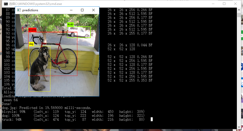 下载完后,和上面一样放入..\darknet-master\build\darknet\x64中,然后双击双击darknet_yolo_v3.cmd就能正确的出现以下结果
