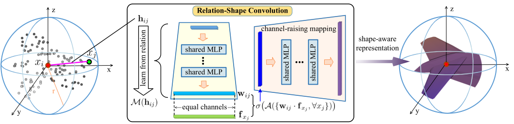 首先,如果将这个公式套用在2D图像当中,则$\tau(f_{x_{j}})=W_j \cdot f_{x_j}$,其中$w_j$为learnable weight(可以理解为卷积核),“$\cdot$”表示点乘,$\mathcal{A}$表示求和,其实就是一个卷积操作。而传统卷积有两个问题,1是不具备置换不变性,2是没有学习到形状信息。因此,作者对$\mathcal{A}$和$\tau$进行了修改,使其处理点云信息时,具有置换不变性,以及能够学习到形状信息。置换不变性在pointnet中已经实现,就是用max来表示$\mathcal{A}$,那么剩下的就是学习形状信息,那么如何学习形状信息?就是通过这个$\tau$实现的。 为了捕获形状信息(或者关系信息),作者将$\tau$定义为: $$ \tau(f_{x_{j}})=W_{ij} \cdot f_{x_j}=\mathcal{M}(h_{ij})\cdot f_{x_j} $$ $\mathcal{M}$用于将两个点的关系映射为high-level的信息($\mathcal{M}$实际上就是MLP,将低维特征映射成高维特征,而低维特征就是点的位置关系,比如两个点间的距离,相对坐标等),而$h_{ij}$就是低维特征。 RS-Conv的流程图如下: