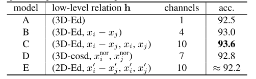 - 对于每个邻居点j,计算j和i的low-level信息,即$h_{ij}$,$h_{ij}$的表示方法很多,作者在论文中将其定义为$h_{ij}=[3D-Ed,x_i-x_j,x_i,x_j]$,即将两点间的欧式距离(1维),相对坐标(3维),i的坐标(3维)和j的坐标(3维)进行拼接,得到一个10维的low-level信息。