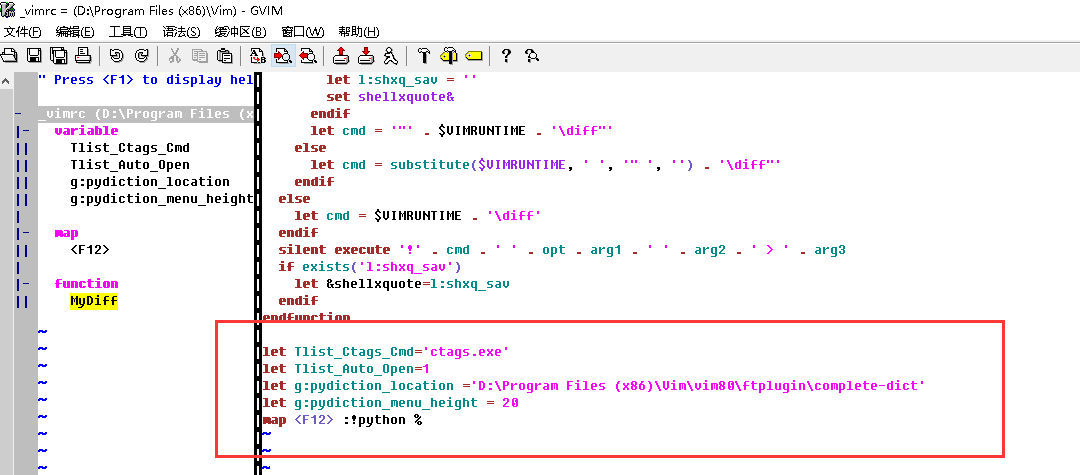 Taglist http://www.vim.org/scripts/script.php?script_id=273 下载解压后将plugin中的taglist.vim拷贝到gvim.exe所在目录下的plugin文件夹中。