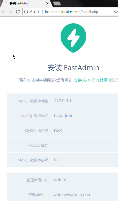 使用浏览器打开 http://fastadmin.localtest.me 看到以下界面说明成功了。