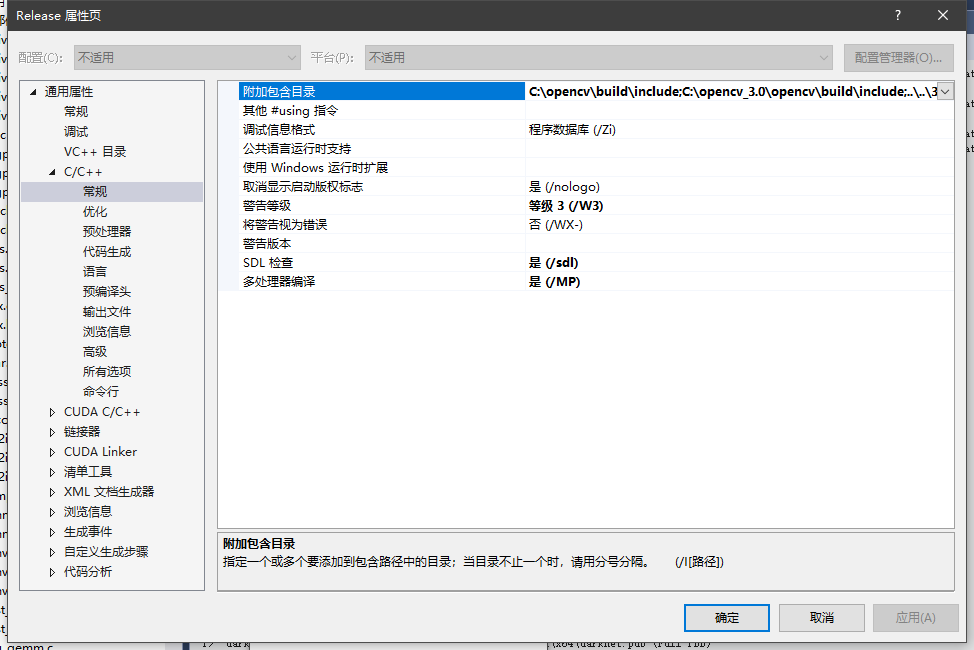 同理选择 C/C++的常规 修改附加包含目录 添加的为opencv文件夹下的include文件夹