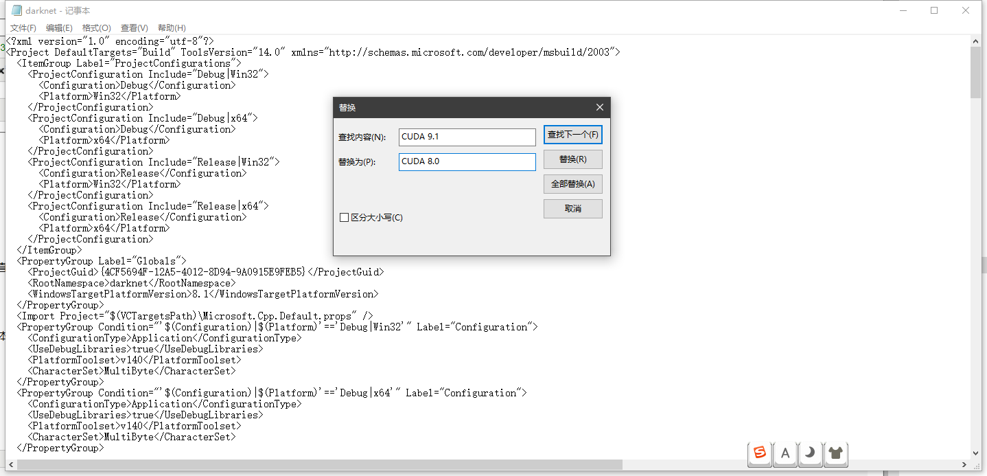 打开../darknet/build/darknet/darknet.vcxproj,用记事本格式打开即可,按下图操作全部替换