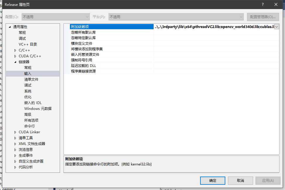 还有一个就是给链接器也改一下,选择附加依赖项,添加 opencv_world340d.lib