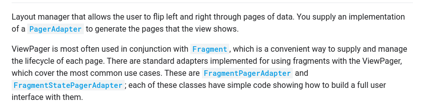ViewPaper就是简单的页面切换组件,我们往里面填充View,然后就可以使用左滑和右滑来进行View的切换。和RecycleView(或者ListView)很类似,我们都需要使用Adapter(PagerAdapter)来填充数据。google官方文档中,推荐我们使用Fragment来填充ViewPager。