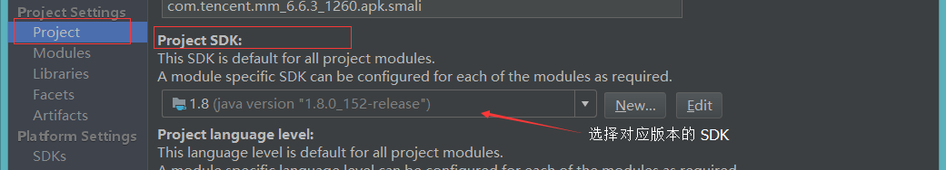 (3) 配置项目使用的 JDK 版本,选中 项目目录 -> 右键 -> Open Module Settings -> Project ,在右侧 Project SDK 栏中选择安装待调试 apk 的移动设备所使用的 JDK 版本。(在笔者使用的 Android Studio 3.0.1 版本的导入过程中,Android Studio 会询问项目将会使用的 SDK 版本,直接在该提示界面中选择所需的 JDK 版本即可.)