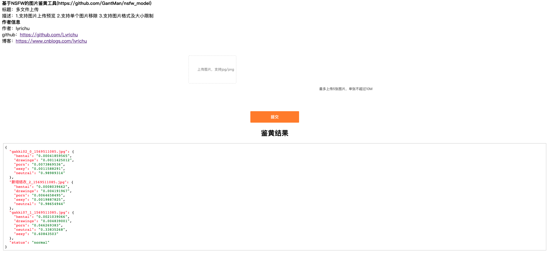 1. http://www.huchengchun.com:8127/porn_classification 提供了一个简易的网页工具,用户可以上传若干张图片,服务端会传回每一张图片是否是色情图片的判定,结果的形式是json格式。截图如下: