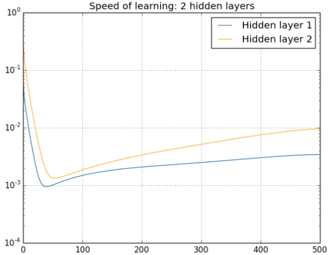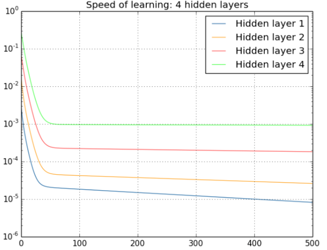 从上图可以非常容易的看出来:对于四个隐层的网络来说,第四隐藏层比第一隐藏层的更新速度慢了两个数量级!!!